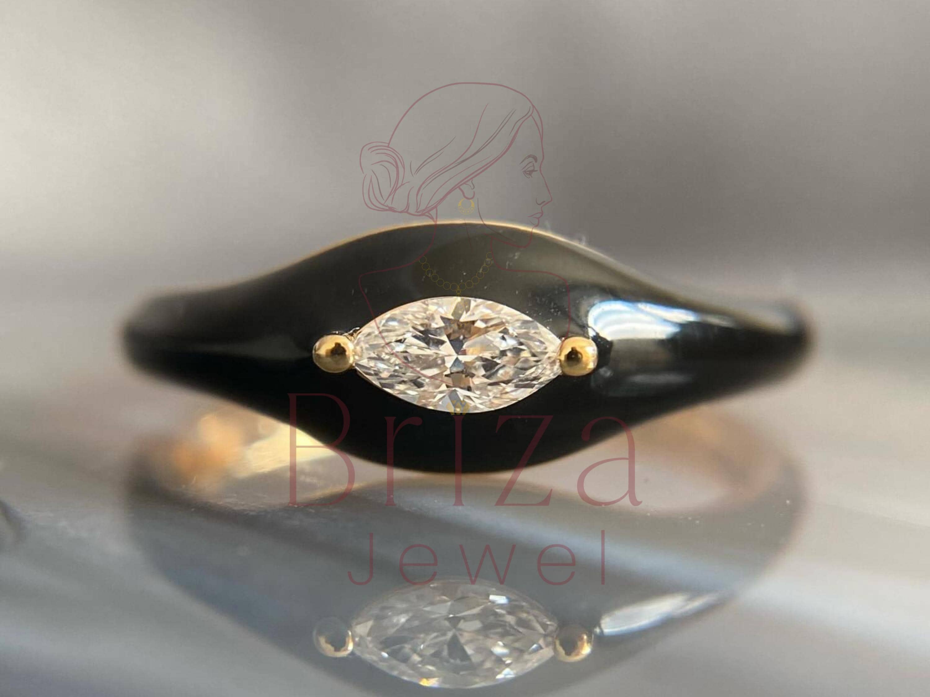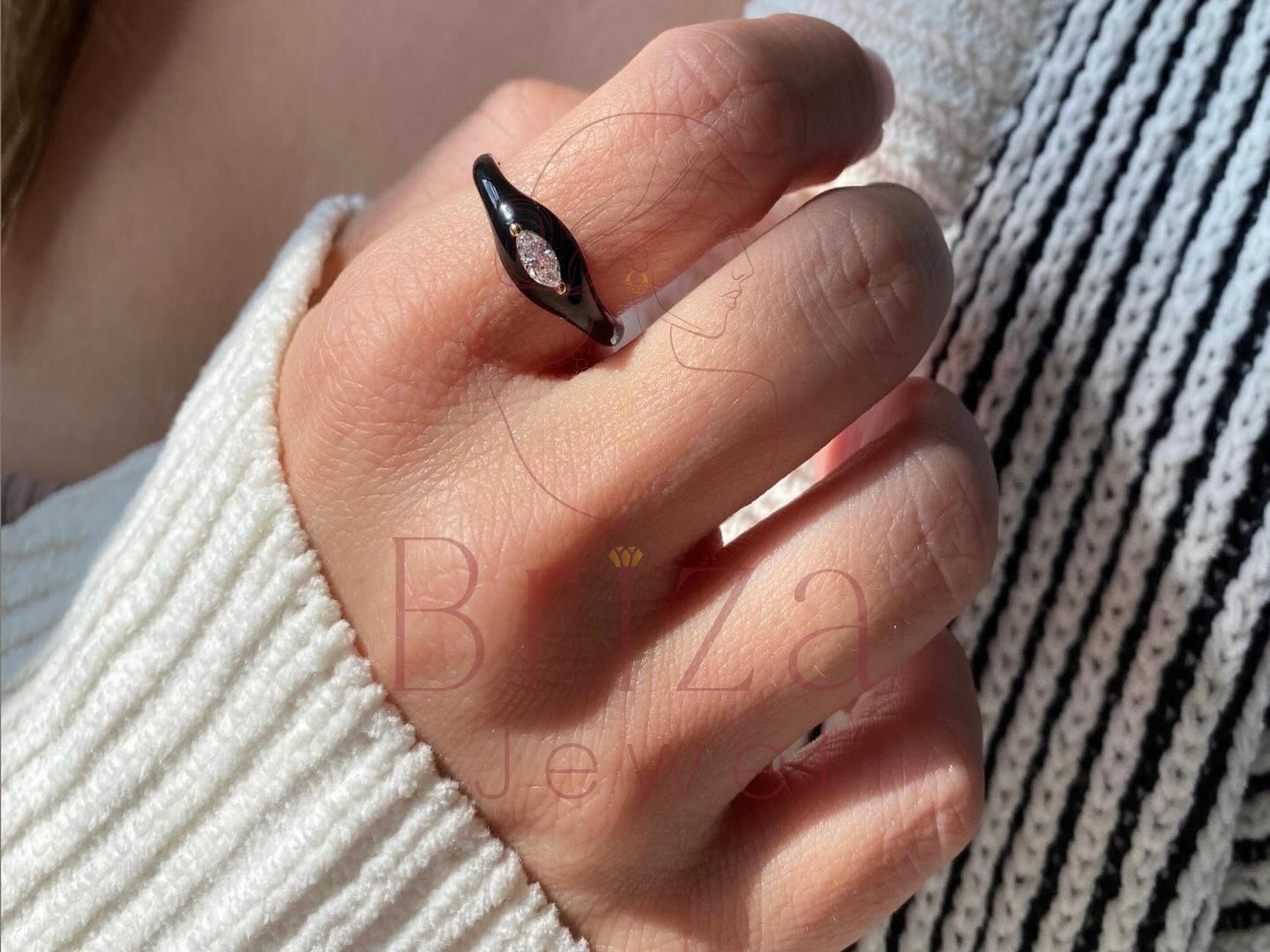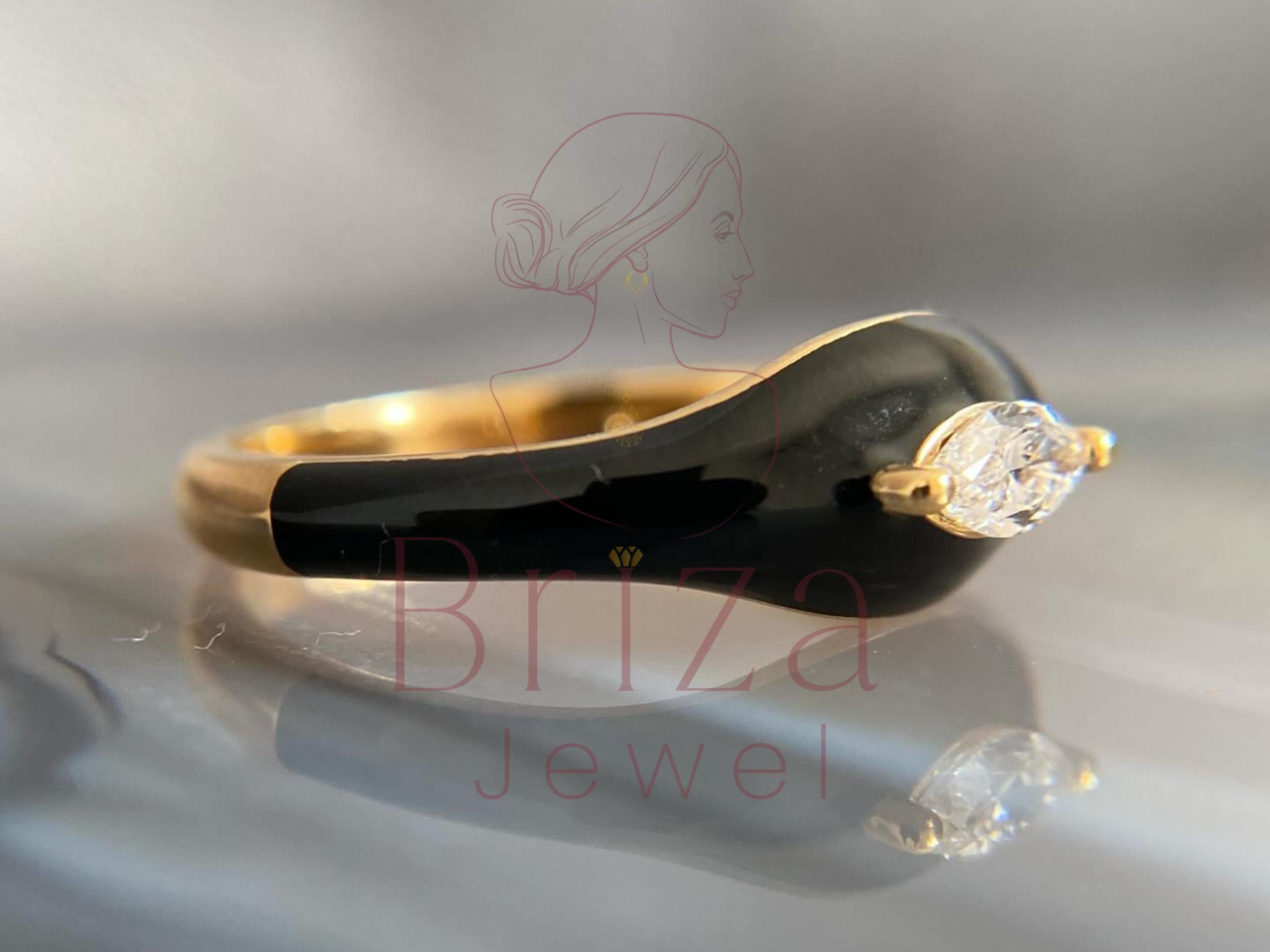 Black Enamel Marquise Moissanite Ring: Dainty Gold Accent, Minimalist Jewelry